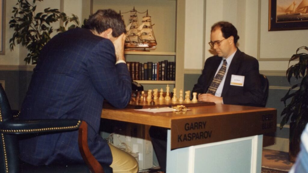 Garry Kasparov e Joe Hoane, da equipe do Deep Blue, durante partida de xadrez de 1997 em Nova York | Imagem: Reprodução/Deep Blue | IBM