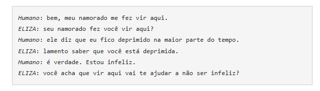 Ainda na década de 1960, um chatbot chamado ELIZA ganha o mundo. Ela funcionava a partir de uma máquina gigante e respondia com base em palavras chave.